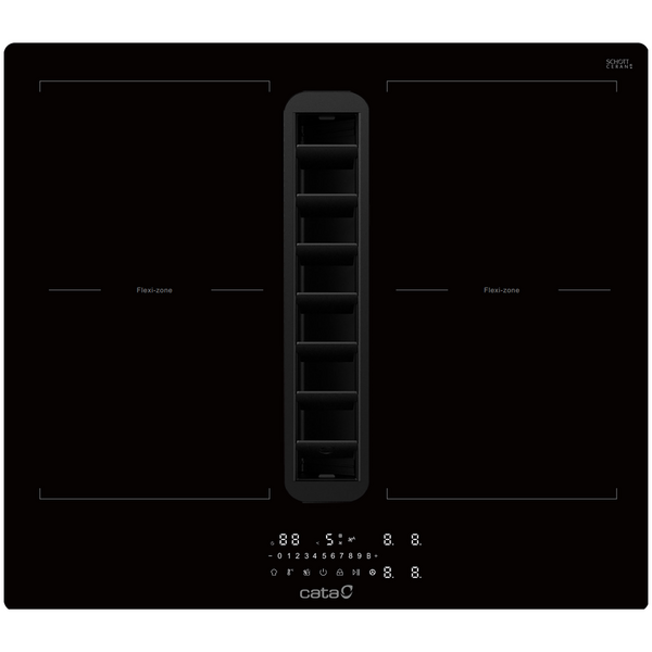The CATA 60cm 4 Zone Flex Vented Induction Hob combines sleek modern design with powerful integrated extraction for a cleaner, more efficient kitchen experience. Its smooth black glass finish with a matching grille complements any contemporary cooking space, while hidden touch slider controls and a clear white LED display provide effortless precision and a streamlined look. With four induction zones including two flexible cooking areas, this hob adapts to pans of various sizes and shapes, giving you complete freedom in your cooking.